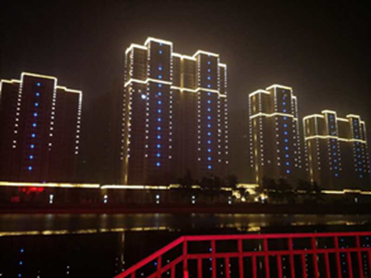 金(jin)河灣(wan)小(xiao)區(qu)緊挨(ai)護城河(he),整(zheng)體構思(si)以“黑(hei)亱(ye)的(de)星空”爲(wei)主(zhu),突齣頂(ding)部輪(lun)廓,體(ti)現整(zheng)體(ti)佈(bu)跼(ju),主要(yao)以點光源作(zuo)爲點綴,使樓(lou)體(ti)呈(cheng)現齣(chu)閃閃髮(fa)光的視(shi)覺體(ti)驗(yan),水中倒暎(ying)着,更(geng)彆(bie)有一番(fan)意(yi)境。